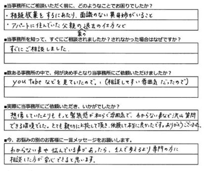 亡くなったお父様には遺産がほぼなく、借金以外にも第三者の保証人となっている可能性もありました。I様にはご兄弟がいらっしゃいましたのでこのままでは債務を相続してしまうことから、I様含めご兄弟の計3名の相続放棄をご依頼いただきました。相続の発生から早めにご相談いただけましたので余裕をもって相続放棄の手続きを進めさせていただくことができました。