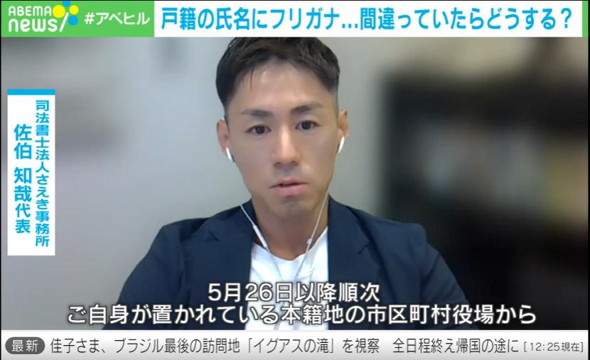 2025年6月16日12時から放送されたABEMA TVのABEMAヒルズという番組の特集コーナーで、改正戸籍法によるフリガナの届出手続きについて当事務所の代表佐伯知哉が専門家として出演しました。