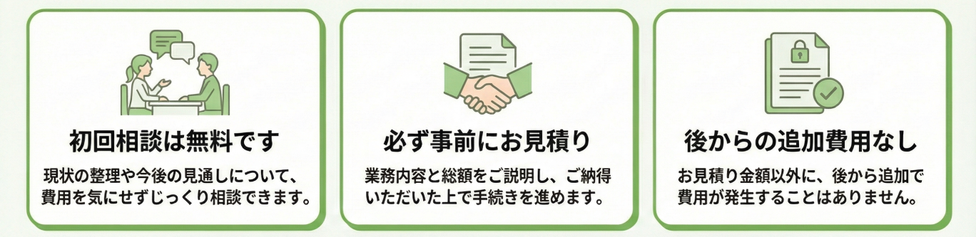 さえき事務所では、お客様に安心してご依頼いただけるよう、曖昧な金額提示は一切いたしません。 必ず業務内容と費用の総額をご説明し、ご納得いただいた上で手続きを進めることをお約束します。